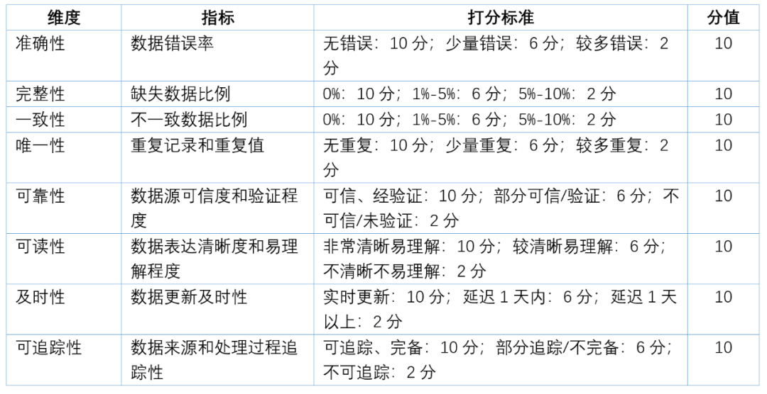 3、關(guān)于數(shù)據(jù)質(zhì)量評估的打分標準可以參考以下表格: