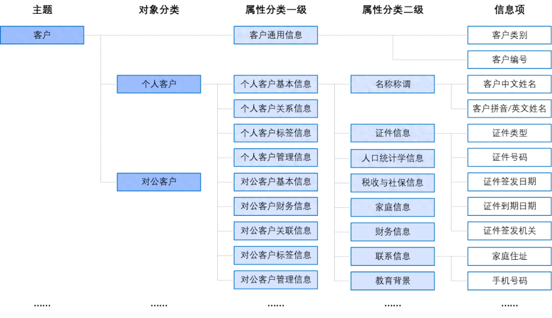 在構建數據資產目錄時,需要綜合考慮不同的數據資產類型,定義它們的屬性,包括業務屬性、管理屬性、應用模式、資產目錄視角等。 這有助于形成企業級數據資產目錄,具有權威性、可信性和可用性,并且能夠滿足各種不同的需求。 以業務領域為例,資產目錄可以通過資產清點來梳理銀行數據的主題分類和核心業務板塊,然后根據業務要素逐步劃分二級目錄、三級目錄,最終達到葉子節點的信息項。 信息項的定義是根據業務需求進行的,例如,客戶信息包括客戶名稱、聯系方式、地址、證件類型、證件號碼等。