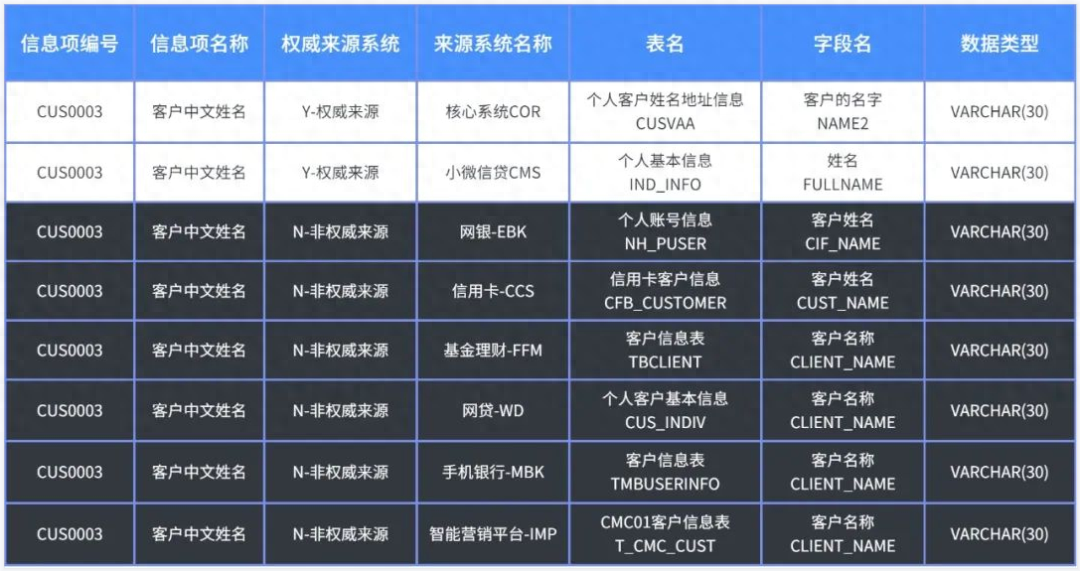例如,以“客戶中文姓名”這一信息項為例,可以通過技術元數據確定數據來源與系統表之間的映射關系。