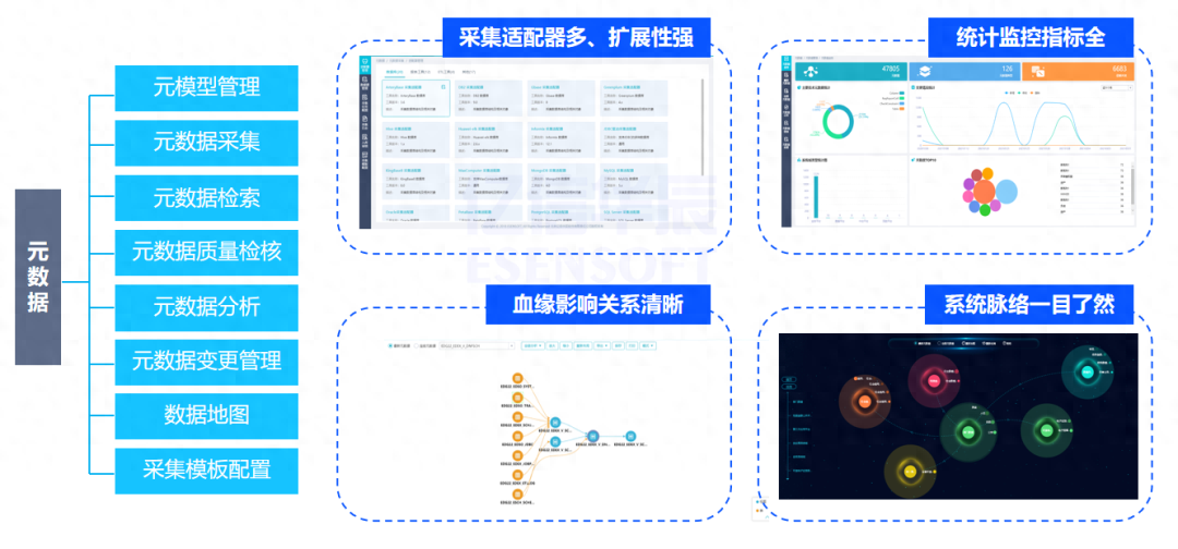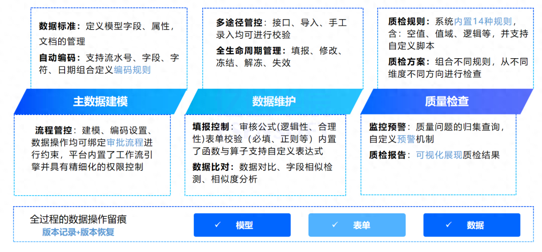 數(shù)據(jù)采集和追蹤、數(shù)據(jù)模型管理和檢查、數(shù)據(jù)標(biāo)準(zhǔn)制定和映射、數(shù)據(jù)質(zhì)量檢核和整改、數(shù)據(jù)服務(wù)開發(fā)和監(jiān)控、資產(chǎn)目錄編制和共享等核心數(shù)據(jù)資產(chǎn)管理活動(dòng)的工具支持,并保證這些活動(dòng)能夠持續(xù)進(jìn)行。