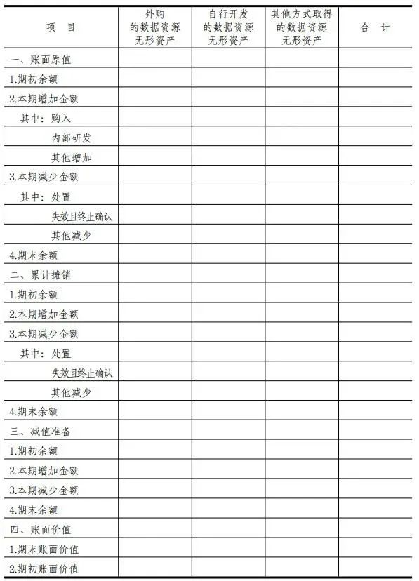 企業應當按照外購無形資產、自行開發無形資產等類別,對確認為無形資產的數據資源(以下簡稱數據資源無形資產)相關會計信息進行披露,并可以在此基礎上根據下表實際情況對類別進行拆分。具體披露格式如下: