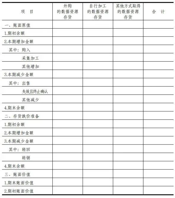 企業應當按照外購存貨、自行加工存貨等類別,對確認為存貨的數據資源(以下簡稱數據資源存貨)相關會計信息進行披露,并可以在此基礎上根據實際情況對類別進行拆分。具體披露格式如下: