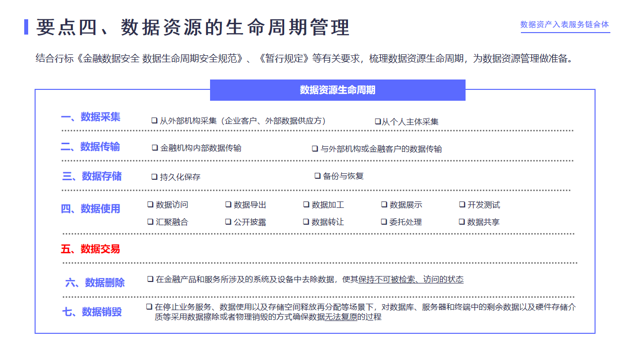 現代數據資源的全生命周期包括采集、傳輸、存儲、使用、交易、刪除、銷毀等,實際會更復雜,比如數據使用里有數據的訪問、導出、加工、展示等場景,這些工作就要圍繞內部確權的結果來開展。