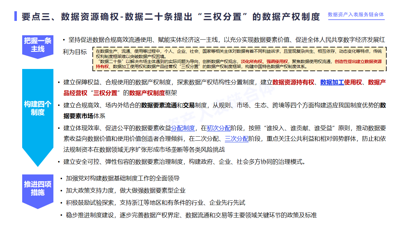 數據20條淡化了數據的所有權,提出來的三權分制:包括數據資源的持有權、數據的加工權使用權、數據產品的經營權三種權利。