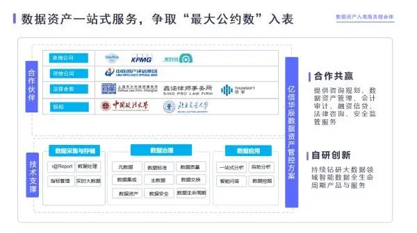 億信華辰現與DAMA中國、畢馬威、數支科技、中聯資產評估集團、北京鑫諾律師事務所、中國政法大學、北京交通大學等成立數據資產入表服務鏈合體,拉通會計服務提供方、數據合規評估方、數據資產評估方、數據技術服務方等資源,構建全流程閉環式服務體系,為客戶提供一站式數據資產解決方案,提供咨詢規劃、數據資產管理、會計審計、法律咨詢、安全監管服務,保障數據資產入表規范可信,促進數據要素經濟高質量發展。