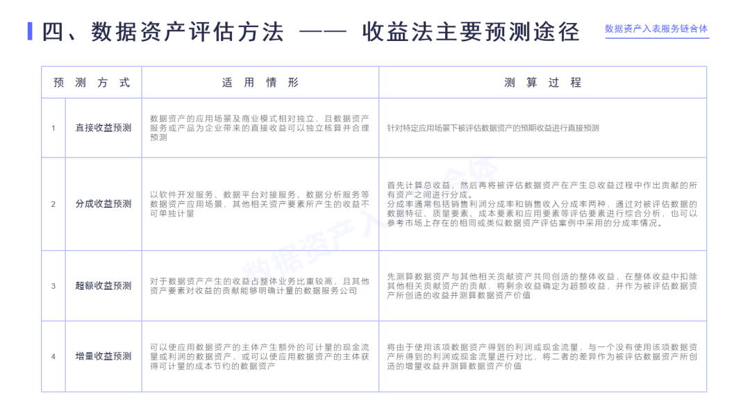 收益法:資產的價值由資產的收益所決定,有四種場景可以判斷:直接收益、分層收益、超額收益、增量收益,分別有不同的適用范圍。基于現有應用場景的數據資產,總能找到相應的適合收益預測的路徑來確定它的價值。