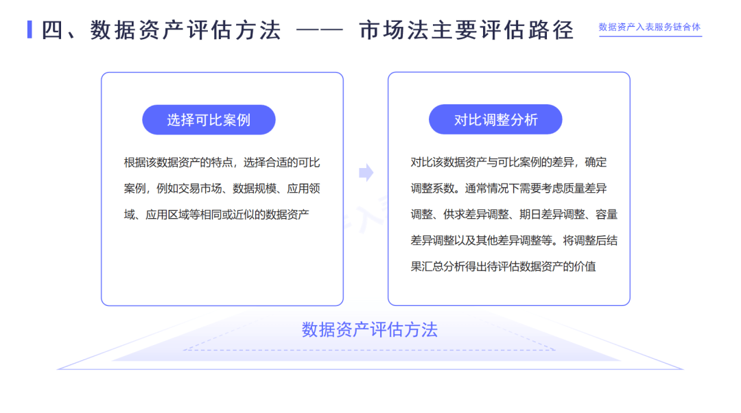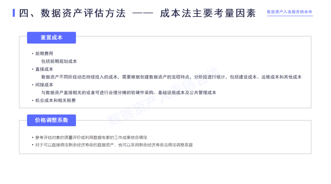 成本法:結合形成數據資產的相關投入,在要評估它價值的時間點,確定現在投入是一個什么樣的價格水平,基于重置成本需要進行相應的價格調整。如果前面的重置成本是一個完整年限的數據資產,要進行年限的調整;同時有影響數據資產價值的質量因素,也要進行質量的調整。