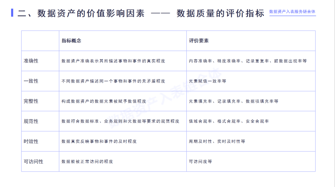 數據質量評價的國家標準,包括六個維度的指標:準確性、一致性、完整性、規范性、時效性和可訪問性,這也是數據資產價值評估需要去考量的關鍵因素。