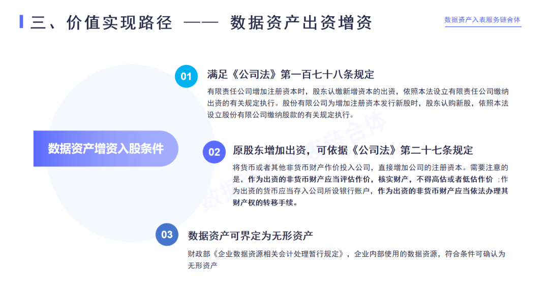 數據資產可以拿當資本金使用,用于出資增資,實現數據入股。自《公司法》修訂之后,作為公司出資的資本不再局限于貨幣資金, 可以以非貨幣的資產來進行出資。符合一定條件的數據資源已經是數據資產,即使是一個表外資產也具備出資的功能,明年甚至會成為表內資產,也具備出資的功能,因此可以拿數據資產來進行出資。