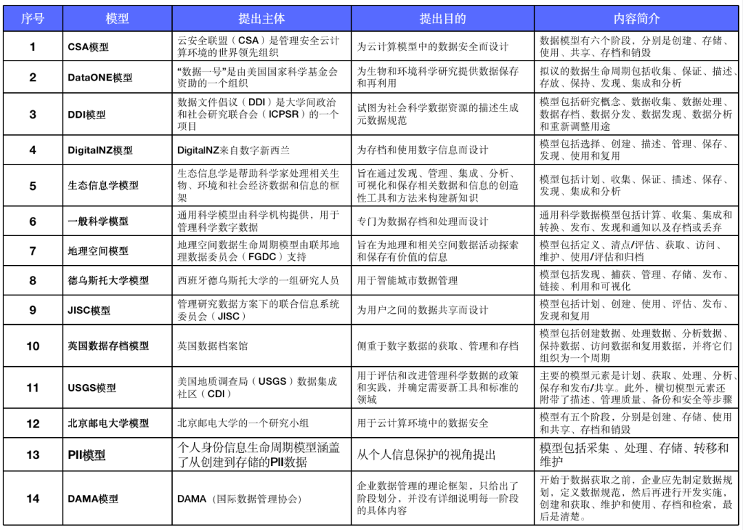 許多模型都是為解決數據管理中的一個特定問題或特定目的而設計的,通過對比分析可以發現有些階段是每個模型共同的,比如數據創建/接收,有些階段則是獨有的,比如
