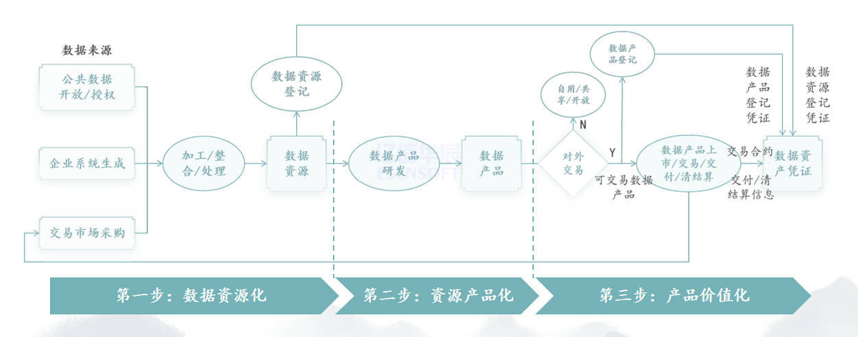 首先是數(shù)據(jù)資源化階段,企業(yè)對(duì)公共數(shù)據(jù)、系統(tǒng)生成數(shù)據(jù)、市場(chǎng)采購數(shù)據(jù)進(jìn)行綜合處理和整合,形成一份經(jīng)過登記的資源清單,標(biāo)志著數(shù)據(jù)進(jìn)入資源化的階段。