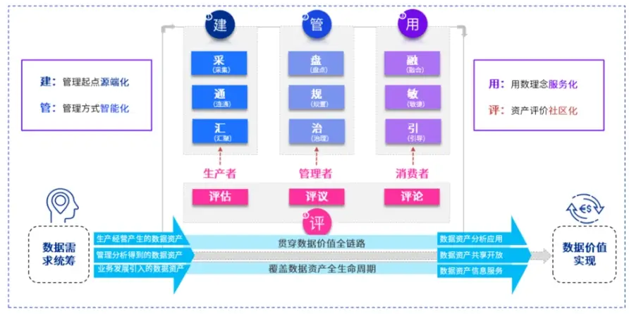總結出“建、管、用、評”,以及“采集、連通、匯聚,盤點、規置、治理,融合、敏捷、引導,評估、評議、評論”一體化的數據管理體系。