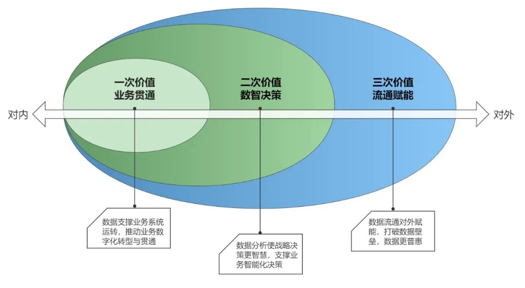 數據要素究竟如何發(fā)揮其作為生產要素的價值,需要進一步分析厘清。隨著信息技術的發(fā)展和產業(yè)應用的演化,數據要素投入生產的途徑可分為三次價值釋放過程,即數據支撐業(yè)務貫通、數據推動數智決策、數據流通對外賦能,如上圖所示。需要注意的是,之所以說這三次價值是數據要素價值釋放的三條途徑,是因為一方面這三次價值之間存在一種遞進關系,后者往往以前者為基礎;另一方面,這三條途徑存在一種并列關系,這些價值可以且有必要同時予以關注、同時充分釋放。