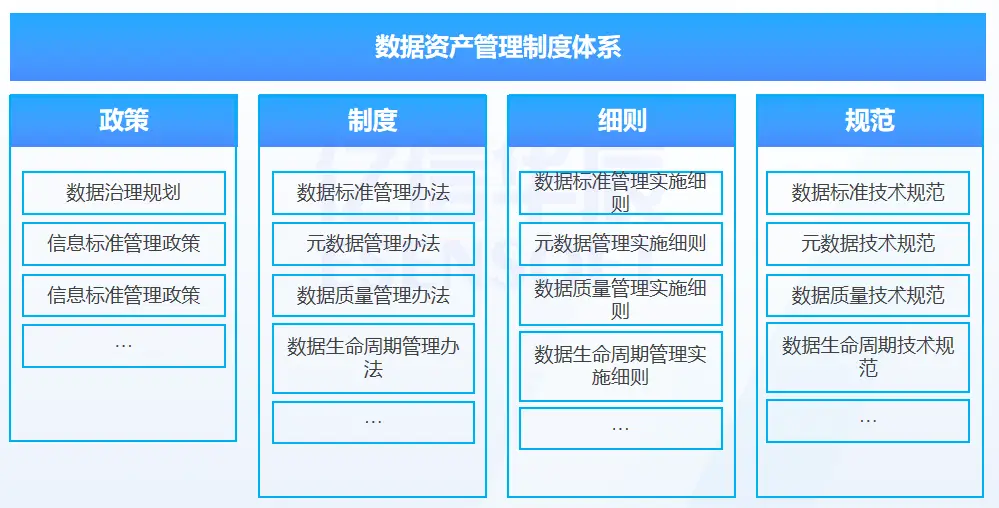 除了組織保障外,制度體系的設(shè)計(jì)也至關(guān)重要。數(shù)據(jù)資產(chǎn)管理制度體系通常應(yīng)分層次設(shè)計(jì),根據(jù)管理的顆粒度,可劃分為組織級(jí)數(shù)據(jù)資產(chǎn)管理總體政策規(guī)定、管理辦法、實(shí)施細(xì)則和操作規(guī)范四個(gè)層次。這些制度將作為憑證,向監(jiān)管部門或資產(chǎn)評(píng)估部門提交相應(yīng)證據(jù),確保數(shù)據(jù)資產(chǎn)管理工作的合規(guī)性和有效性。