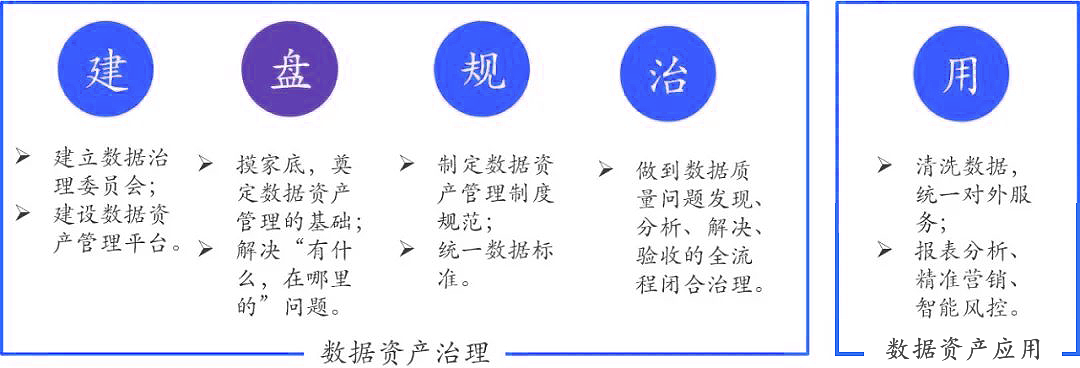 在數據資產管理實踐工作中,“建”、“盤”、“規”、“治”、“用”是重要的實踐手段和方案。“建”主要指的是建立數據資產管理的相關組織、人員及工具,在“建”的基礎上開展數據資產盤點工作,不僅摸清家底,更為后續工作的開展奠定了良好基礎。“規”主要指的是建立數據資產管理規范,做到有章可循;“治”主要指的是對