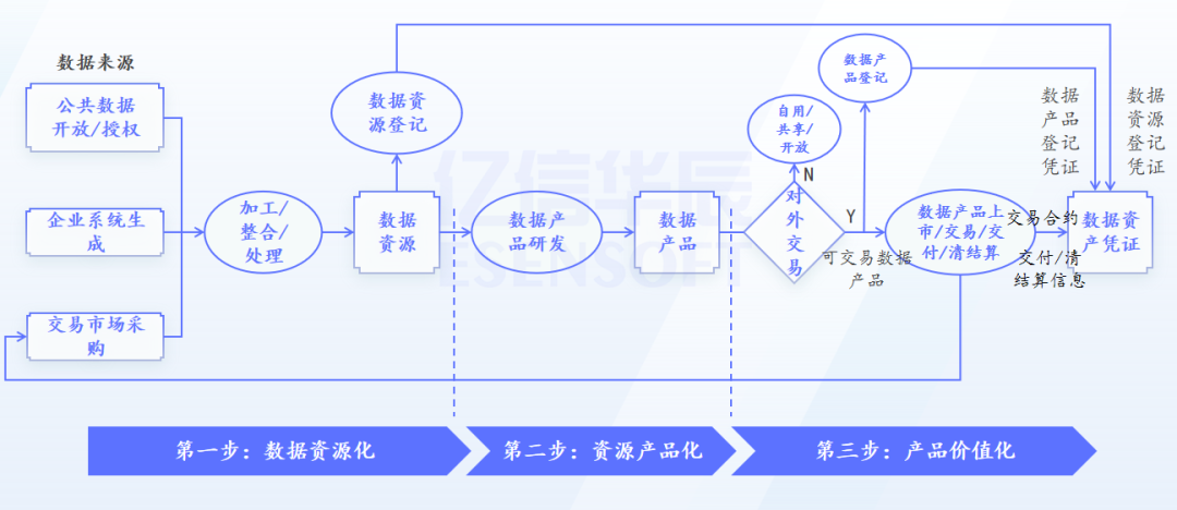 從技術上拆解數據要素價值的生成路徑,企業數據要素與資產運營的建設路徑可分為三個關鍵階段:數據資源化、資源產品化和產品價值化。