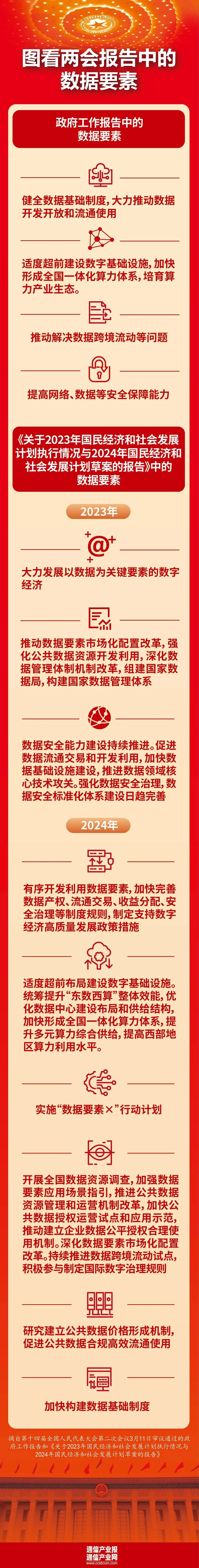 第十四屆全國人民代表大會第二次會議在圓滿完成各項議程后,3月11日下午在北京人民大會堂閉幕。大會批準政府工作報告、全國人大常委會工作報告、《關于2023年國民經濟和社會發展計劃執行情況與2024年國民經濟和社會發展計劃草案的報告》(以下簡稱《計劃報告》)等。回顧今年全國兩會,政府工作報告、《計劃報告》等對數據要素開放開發、流通利用等方面的工作制定了明確的政策取向,提出了具體要求,將有力推動社會各方數據要素相關工作的開展。那么,今年兩會報告關于數據要素都有哪些頂層設計?《通信產業報》全媒體梳理今年全國人大會議通過的政府工作報告、《計劃報告》有關數據要素相關工作的表述,供業界參考。