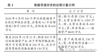 在數(shù)據(jù)資源存貨的后續(xù)計(jì)量方面,企業(yè)在資產(chǎn)負(fù)債表日需要對存貨按照成本與可變現(xiàn)性可變現(xiàn)凈值孰低進(jìn)行計(jì)量。當(dāng)存貨成本高于其可變現(xiàn)凈值時,則需要計(jì)提存貨跌價準(zhǔn)備,計(jì)入當(dāng)期損益。企業(yè)在資產(chǎn)負(fù)債表日,應(yīng)以確鑿證據(jù)為基礎(chǔ)去確定數(shù)據(jù)資源存貨的可變現(xiàn)凈值。發(fā)生跌價的,應(yīng)當(dāng)按照可變現(xiàn)凈值計(jì)量,同時按照其成本高于可變現(xiàn)凈值的差額計(jì)提跌價準(zhǔn)備,并計(jì)入當(dāng)期損益中。案例企業(yè)數(shù)據(jù)資源存貨的后續(xù)計(jì)量方法如表2所示。
