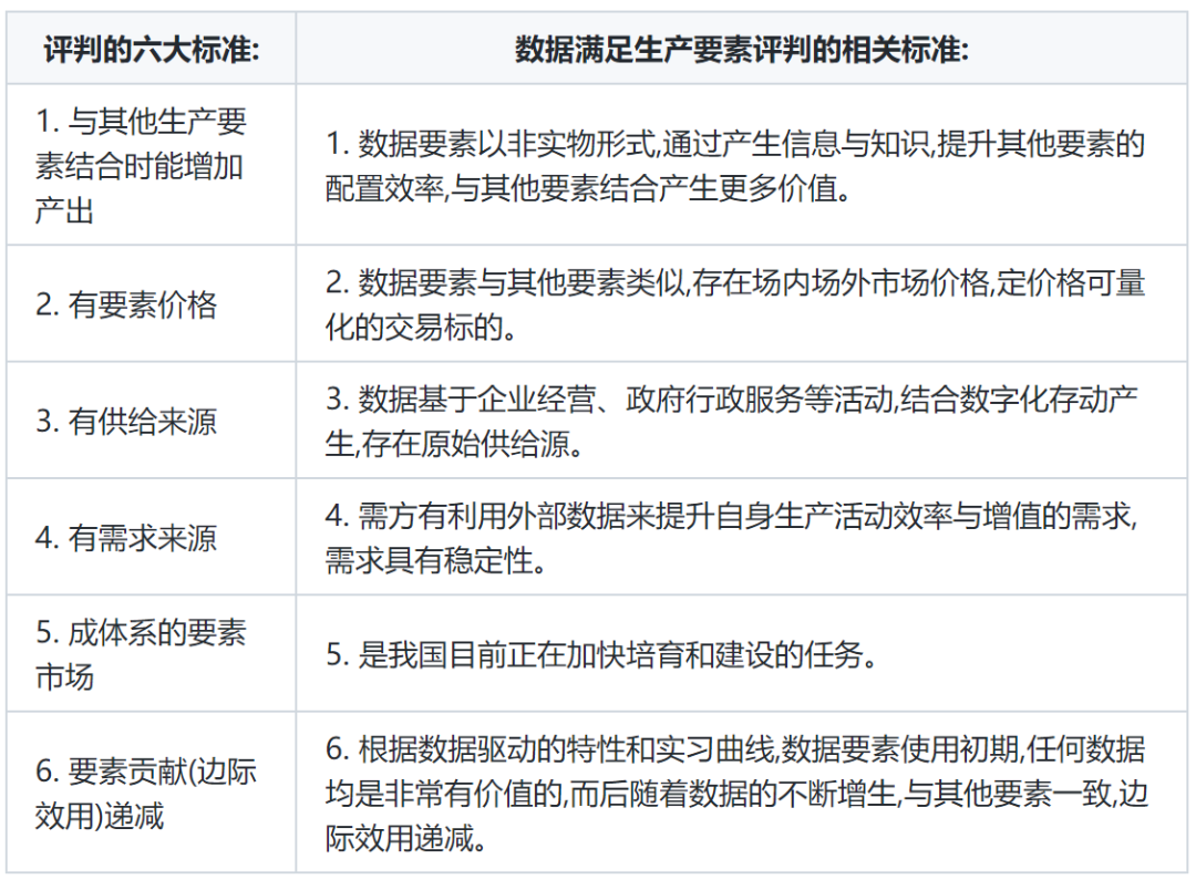為什么數據能作為生產要素,下表是生產要素的評判6大標準,可以看到數據在我國成為生產要素的條件逐步成熟。