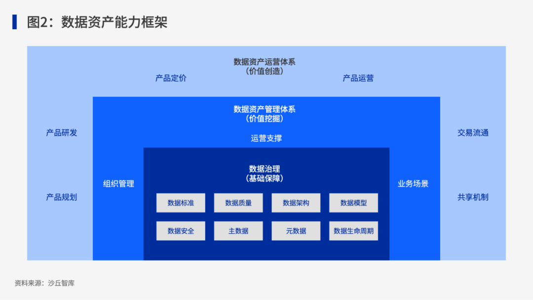在健全數(shù)據(jù)資產(chǎn)能力時,企業(yè)首先要以數(shù)據(jù)治理作為基礎(chǔ)保障,做好數(shù)據(jù)標(biāo)準(zhǔn)、數(shù)據(jù)質(zhì)量、數(shù)據(jù)架構(gòu)、數(shù)據(jù)模型、數(shù)據(jù)安全、主數(shù)據(jù)、元數(shù)據(jù)、數(shù)據(jù)生命周期,提升數(shù)據(jù)質(zhì)量、保證數(shù)據(jù)安全使用,在此基礎(chǔ)之上,通過數(shù)據(jù)資產(chǎn)管理和數(shù)據(jù)資產(chǎn)運(yùn)營實現(xiàn)數(shù)據(jù)資產(chǎn)的保值和增值,進(jìn)一步促進(jìn)數(shù)據(jù)資產(chǎn)的交易和流通。