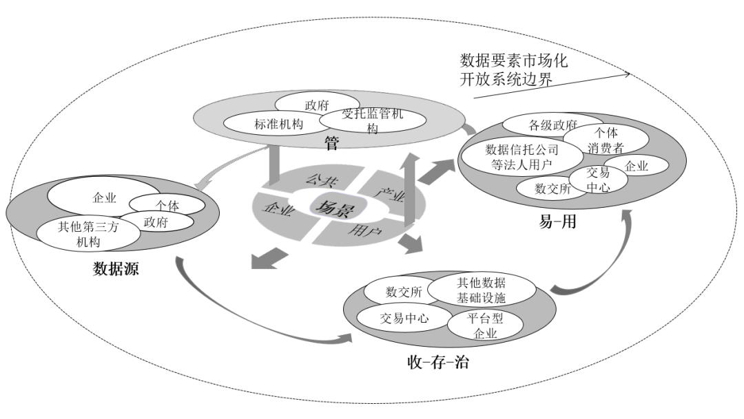 場景驅動數據要素市場化配置既符合場景驅動的內涵特征,又包含數據要素市場化配置的理論實踐,其核心在于以“公共—產業—企業—用戶”等不同維度場景下數據要素市場化配置的重點和痛點為抓手,由數據源出方、數據“收—存—治—易—用”的各個主體共同構成數據要素市場化配置的生態底座,由數據監管主體發揮頂層設計與監管功能,保障數據要素安全交易,順暢流通。其中,政府、企業、個人等作為數據源供給海量數據;數據交易所、企業、數據交易中心等在“收—存—治”階段發揮主要作用,共同將數據激活,轉變為知識狀態;數據交易所、企業、各級政府、個人等結合場景需求與痛點參與數據的交易和使用過程,充分激活數據的場景價值;政府、標準機構、受托監管機構等在此過程中承擔監管職能,保障數據交易流通。通過多元主體的生態價值共創精準打通數據要素市場化配置“收—存—治—易—用—管”的各個核心環節,最終實現生態價值共創。