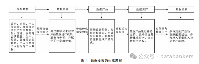 隨著互聯(lián)網(wǎng)和數(shù)字技術(shù)的廣泛應(yīng)用,經(jīng)濟(jì)社會(huì)生活的諸多活動(dòng)都伴生著各類(lèi)原始數(shù)據(jù),當(dāng)這些原始數(shù)據(jù)體現(xiàn)出價(jià)值后會(huì)被各類(lèi)電子手段數(shù)字工具所讀取并進(jìn)行數(shù)字化編碼,被承載著價(jià)值,在進(jìn)行收集、存儲(chǔ)、清洗、加工、流通后成為結(jié)構(gòu)性的數(shù)據(jù)產(chǎn)品,供各需求主體使用,進(jìn)而成為生產(chǎn)要素參與到社會(huì)生產(chǎn)活動(dòng)中。數(shù)據(jù)要素并非與生俱來(lái)的,即便在數(shù)字技術(shù)影響下的數(shù)字經(jīng)濟(jì)活動(dòng)中隨時(shí)隨地會(huì)出現(xiàn)各類(lèi)數(shù)據(jù),但也并非所有的數(shù)據(jù)都能夠成為生產(chǎn)要素,即數(shù)據(jù)要素。數(shù)據(jù)要素的具體生成流程如圖1所示。