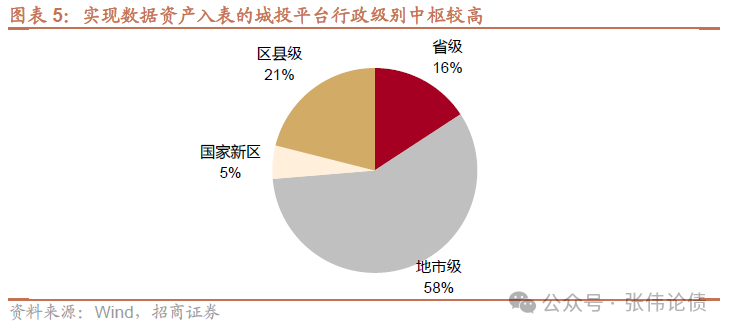 實現數據資產入表的城投平臺以省級和地市級為主,行政級別中樞較高。具體來看,19家城投平臺中,省級平臺、地市級平臺、國家新區平臺和區縣級平臺分別為3家、11家、1家和4家,占比分別為16%、58%、5%和21%。地市級及省級平臺數量占比達到74%,說明現階段數據資產入表工作優先在較高層級的城投平臺進行試點。