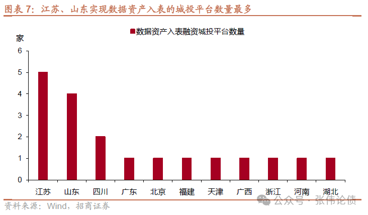 數據資產入表城投主要集中在江蘇、山東。從區域分布來看,19家數據資產入表城投平臺分布在全國11個省級行政區。江蘇、山東的平臺數量最多,分別達到5家、4家。此外,四川有2家平臺實現數據資產入表,廣東、北京、福建、天津、廣西、浙江、河南和湖北等地區各有1家平臺。