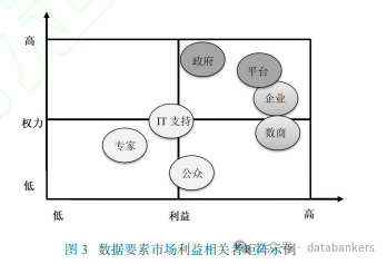 (1)數(shù)據(jù)要素市場(chǎng)參與群體的識(shí)別。中國(guó)數(shù)據(jù)要素市場(chǎng)建設(shè)初步呈現(xiàn)出三級(jí)主體參與的特征院一級(jí)層面。中央政府和地方政府是主導(dǎo)者,統(tǒng)籌規(guī)劃數(shù)據(jù)要素統(tǒng)一大市場(chǎng)構(gòu)建,通過(guò)制定政策法規(guī)實(shí)現(xiàn)制度保障。其中中央政府主要負(fù)責(zé)統(tǒng)籌規(guī)劃和政策研究,地方政府是具體的執(zhí)行者。二級(jí)層面。平臺(tái),交易所等負(fù)責(zé)具體落實(shí)數(shù)據(jù)要素市場(chǎng)建設(shè),包括平臺(tái),系統(tǒng)的開(kāi)發(fā),確定交易模式,建立定價(jià)與信任機(jī)制,數(shù)據(jù)安全保障等。三級(jí)層面。企業(yè),數(shù)商,公眾是數(shù)據(jù)要素供需交易主體。(2)數(shù)據(jù)要素市場(chǎng)利益相關(guān)者權(quán)力/利益分配。如圖3所示,不同利益相關(guān)者在數(shù)據(jù)要素市場(chǎng)擁有不同的權(quán)力地位和利益驅(qū)動(dòng)力。