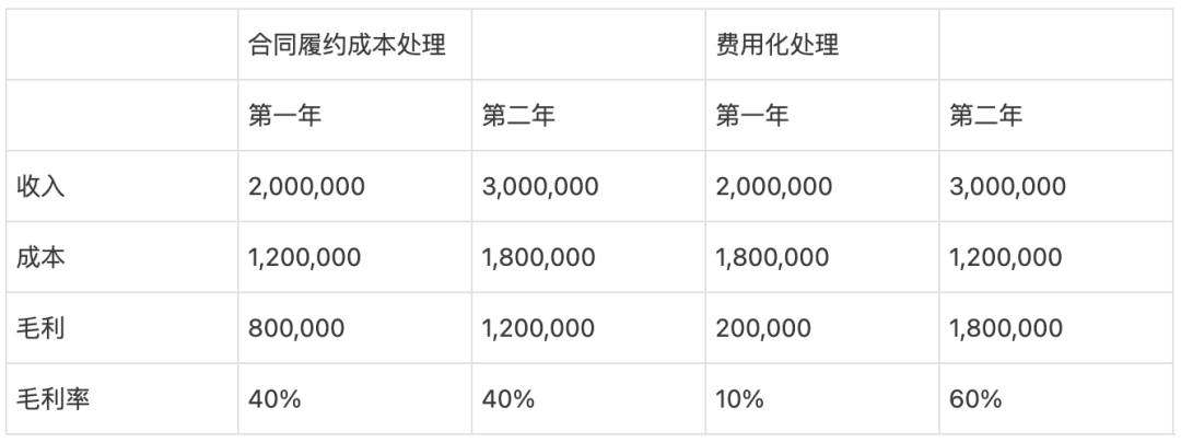 合同履約成本法:兩年毛利率保持一致(40%),更好地反映項(xiàng)目的整體盈利能力。