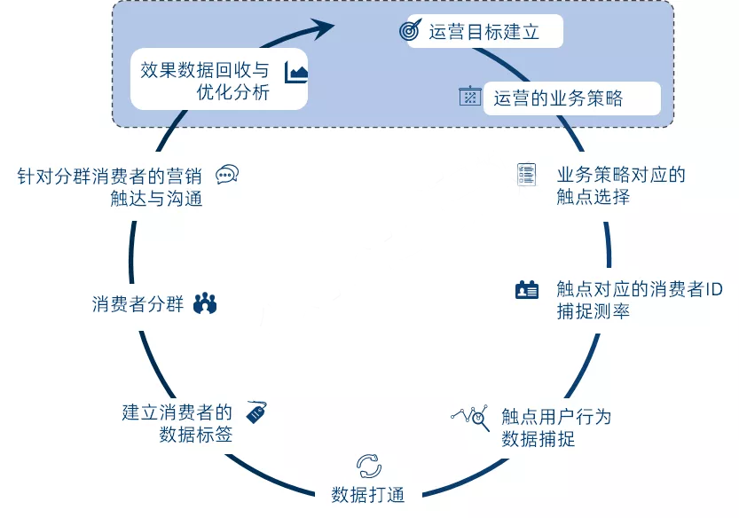 上圖:傳統(tǒng)上我們的消費(fèi)者營(yíng)銷(xiāo)與運(yùn)營(yíng)體系是藍(lán)色框內(nèi)的部分,但為積累數(shù)據(jù)資產(chǎn),必然涉及到更多的數(shù)據(jù)運(yùn)營(yíng)的部分。