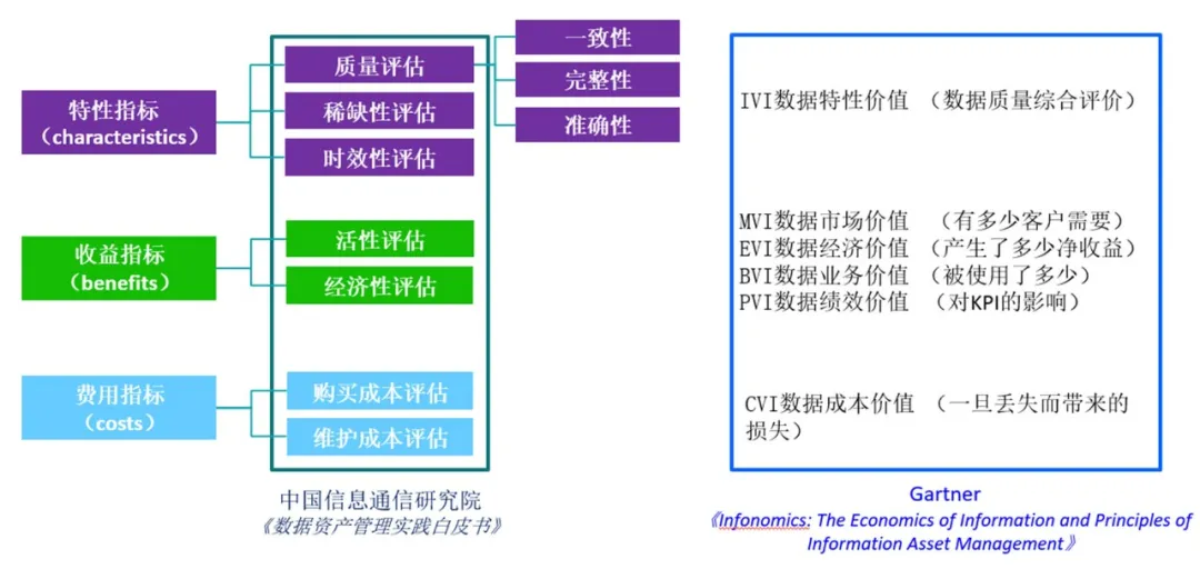 數(shù)據(jù)資產(chǎn)的價值衡量方法有很多,中國信息通信研究院《數(shù)據(jù)資產(chǎn)管理實踐白皮書》中,將數(shù)據(jù)價值評估的緯度分為數(shù)據(jù)成本評估、數(shù)據(jù)價值評估兩大類,其中成本評估包括采集成本、存儲成本、計算成本、運維成本等四類,價值評估包括活性評估、質(zhì)量評估、稀缺性評估、時效性評估以及經(jīng)濟性評估等五類。同時,國外知名研究機構(gòu)Gartner將數(shù)據(jù)的價值分為特性價值、市場價值、經(jīng)濟價值、業(yè)務(wù)價值、績效價值、成本價值等六個緯度。
