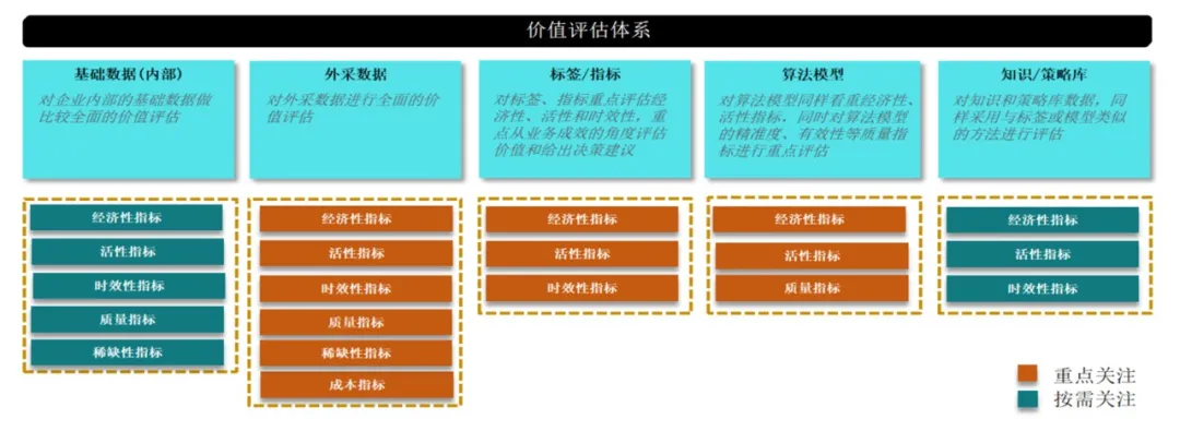 企業(yè)數(shù)據(jù)資產(chǎn)按照使用場景可以分為內(nèi)部基礎(chǔ)數(shù)據(jù)類、外采數(shù)據(jù)類、標(biāo)簽/指標(biāo)類、算法模型類以及知識/策略庫類等,結(jié)合不同數(shù)據(jù)資產(chǎn)的適用場景和特性差異,企業(yè)需要制定差異化的價值評估方法。如對標(biāo)簽/指標(biāo)類數(shù)據(jù)資產(chǎn)重點從業(yè)務(wù)成效的角度評估經(jīng)濟性、活性和時效性等價值,算法模型類數(shù)據(jù)資產(chǎn)除了經(jīng)濟性和活性評估之外,還需要對模型算法的精準(zhǔn)度、有效性等質(zhì)量指標(biāo)進行重點評估,而對于動輒每年百萬或千萬級別采購的外采數(shù)據(jù)類資產(chǎn)則需要特別關(guān)注成本評估及經(jīng)濟性評估。