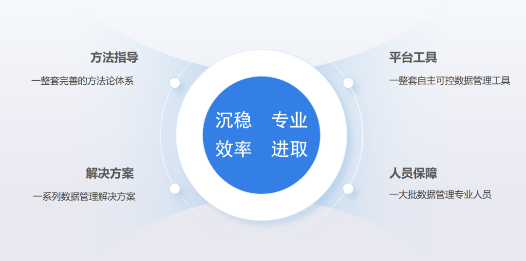 一整套完善的方法論體系:基于DCMM和DAMA數據管理體系,沉淀出成熟、完善且實用的數據管理方法論框架,從指導企業明確自身在數據管理方面的戰略目標,到現狀分析評估,再基于現狀做體系規劃,用工具實現規劃中的各平臺建設,保證實施落地,最后還能為企業培訓,實現知識轉移。