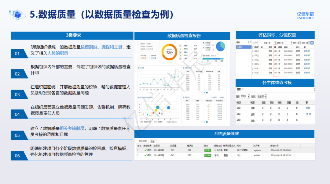 數據質量模塊對于數據的重要程度不言而喻,甚至某種意義上來說,很多的數據治理的工作都是為了去提升數據質量(當然,是多方面的質量),以DCMM數據質量模塊中的數據質量檢查為例,那么億信華辰主要是遵循PDCA的原則,定義規則(規則的來源可以是數據標準,可以是行業標桿,可以是最佳實踐)后進行周期性的質量檢查,在檢查的時候會明確考核績效,有可以量化的權重及最終績效,按照不同的考核主體(如系統維度、業務維度、部門維度)進行打分。