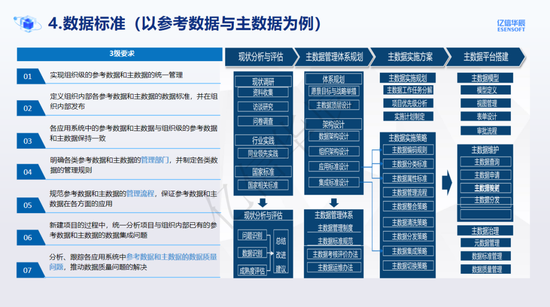 在眾多的數據治理方法論中,數據標準是個比較特殊的模塊,不同的DG體系數據標準的差異較大,例如在DAMA中就沒有單獨的數據標準模塊,而在DCMM中將數據標準置為一級能力域。以參考數據與主數據為例,億信華辰在落地時會重點關注主數據整體的現狀分析評估、管理體系規劃、實施方案設計和MDM平臺落地,是一個完整的鏈路流程。