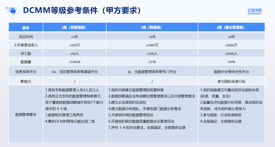 DCMM將數據管理能力成熟度劃分為五個等級,自低向高依次為初始級(1級)、受管理級(2級)、穩健級(3級)、量化管理級(4級)和優化級(5級),不同等級代表企業數據管理和應用的成熟度水平不同。根據評估要求,我們發現2級與3級最大的區別是有沒有專門的數據管理平臺;3級與4級的最大區別是要參與國標或者行標的制定。
