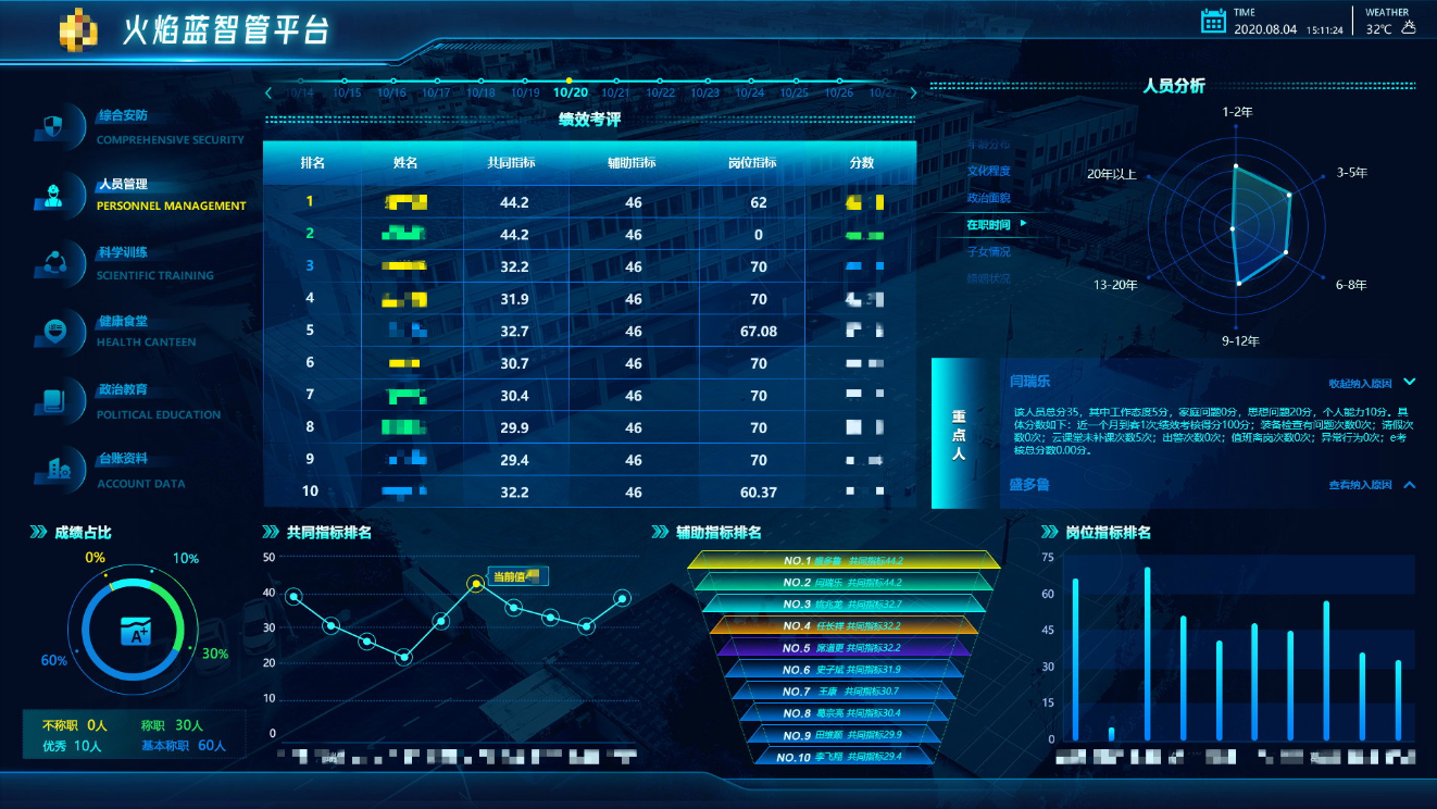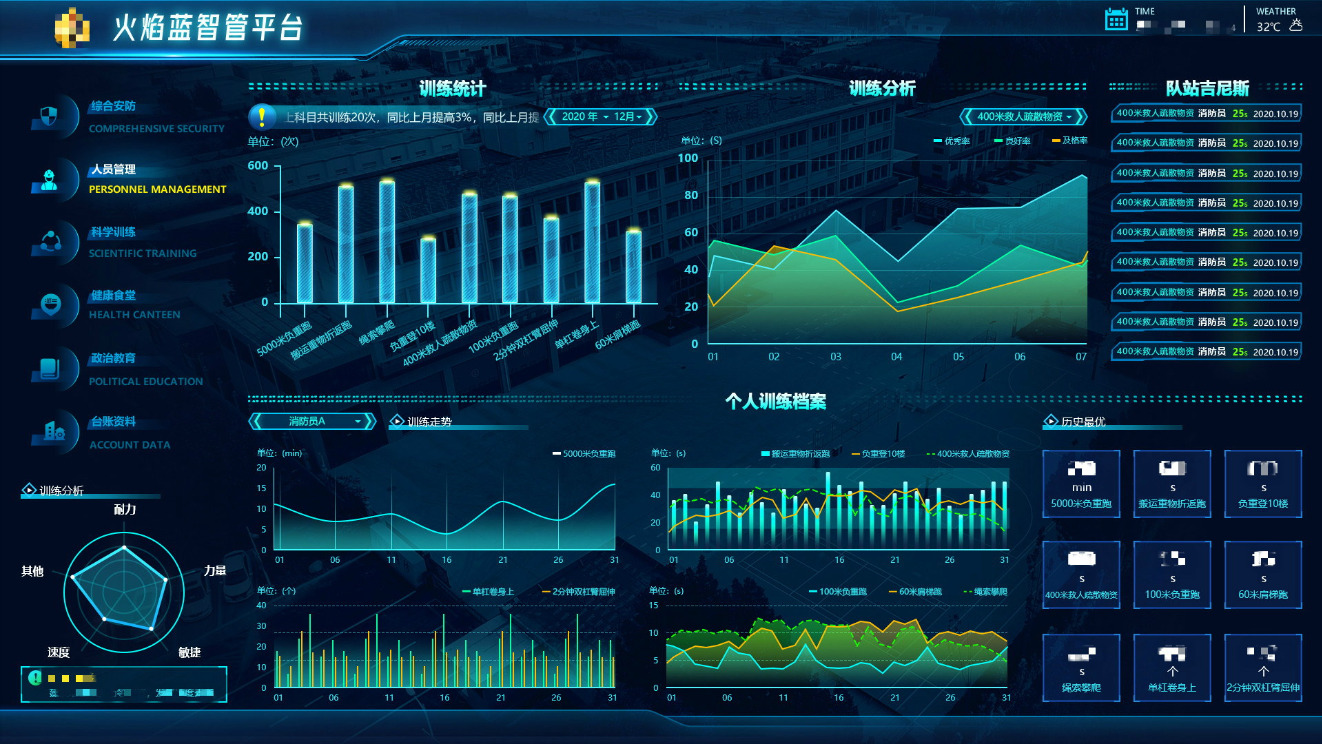 根據(jù)企業(yè)的分析展示訴求,結(jié)合數(shù)據(jù)調(diào)研情況,緊扣消防救援業(yè)務(wù),以管人、定物、抓事、謀戰(zhàn)為主要抓手設(shè)置了六大維度的工作場景,選取所需展示的數(shù)據(jù)指標(biāo),實(shí)現(xiàn)炫酷可視化展示。讓管理者能夠清晰了解消防救援站基本情況以及消防救援隊員、隊站、食堂、訓(xùn)練等管理情況。通過該平臺的構(gòu)建,為做好消防救援隊伍信息展示、決策分析、考評公正、減壓釋負(fù)、服務(wù)實(shí)戰(zhàn)等應(yīng)用工作提供支撐。