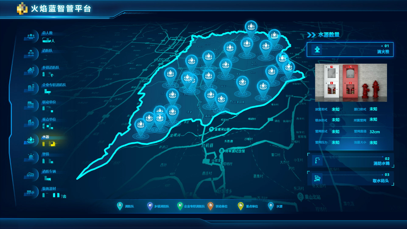運(yùn)用文字、羅馬數(shù)字和統(tǒng)計圖相結(jié)合的方式,展示消防隊、消防救援站當(dāng)前總?cè)藬?shù)、企業(yè)專職消防隊、鄉(xiāng)鎮(zhèn)消防隊、重點(diǎn)單位、聯(lián)動單位、警情、水源、裝備器材、消防車輛、現(xiàn)場指揮現(xiàn)狀等KPI,實(shí)現(xiàn)數(shù)據(jù)鉆取聯(lián)動、掌握實(shí)時數(shù)據(jù)和最新視頻內(nèi)容。