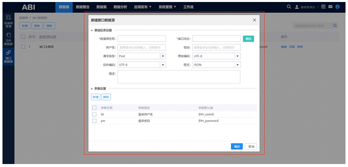 在數據源模塊的“接口數據源”下,點擊“新建”,彈出“新建接口數據源”對話框。