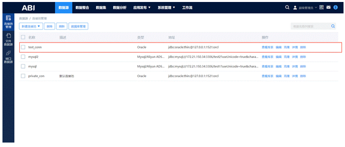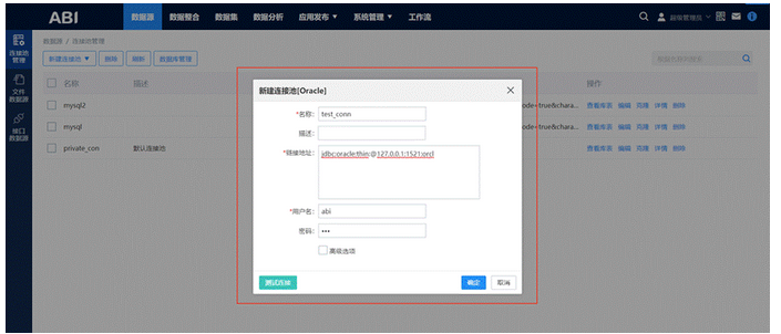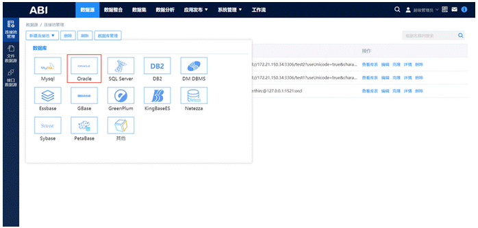 在億信華辰官網打開億信ABI的免費試用版本,在數據源模塊的“連接池管理”下,點擊“新建連接池”,選擇“Oracle”數據庫(這里以Oralce數據庫為例,其他數據庫操作相同)。