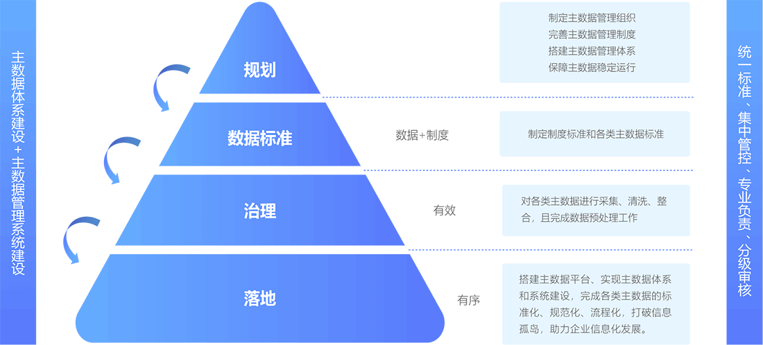 實現對主數據采集、申請、新增、變更、審核、生效、失效、分發等全生命周期管理。支持可自定義的質檢方案到整改的全流程主數據質量管控服務,確保主數據的完整性、準確性、一致性、及時性和可獲取性。