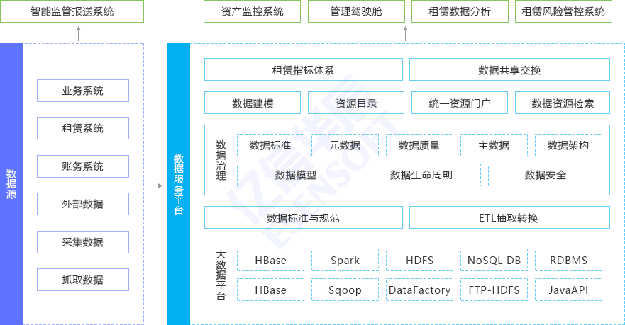 租賃企業立足當今大數據高信息化發展時代,唯有全面管控數據資產,從監管報送、數據存儲、數據模型、數據治理到數據應用,實現覆蓋租賃全行業范圍的全生命周期管控。