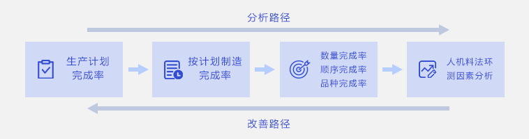 依據(jù)指標(biāo)視圖和分析路徑,結(jié)合定時(shí)或即時(shí)數(shù)據(jù)抽取和分析,對(duì)標(biāo)過(guò)程改善結(jié)果推進(jìn)改善。以下為生產(chǎn)計(jì)劃完成率的分析和改善示例